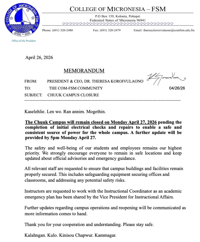 CHUUK CAMPUS CLOSURE MONDAY APRIL 27, 2026