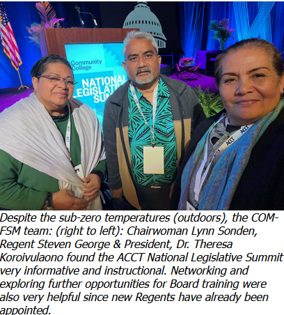A meeting between COM-FSM and selected ACCT partners, included discussions for a second Governance Leadership Institute (GLI) in the Micronesian region later this year. Furthermore, COM-FSM has yet to hold a Board training retreat that was deferred from 2025. Potential dates were also discussed for the retreat to take place around the middle of this year. Overall, participating in the discussions and attending the presentations with fellow community college trustees/regents, presidents and senior administrators provided significant insights for our own Board of Regents’ continuous improvement.